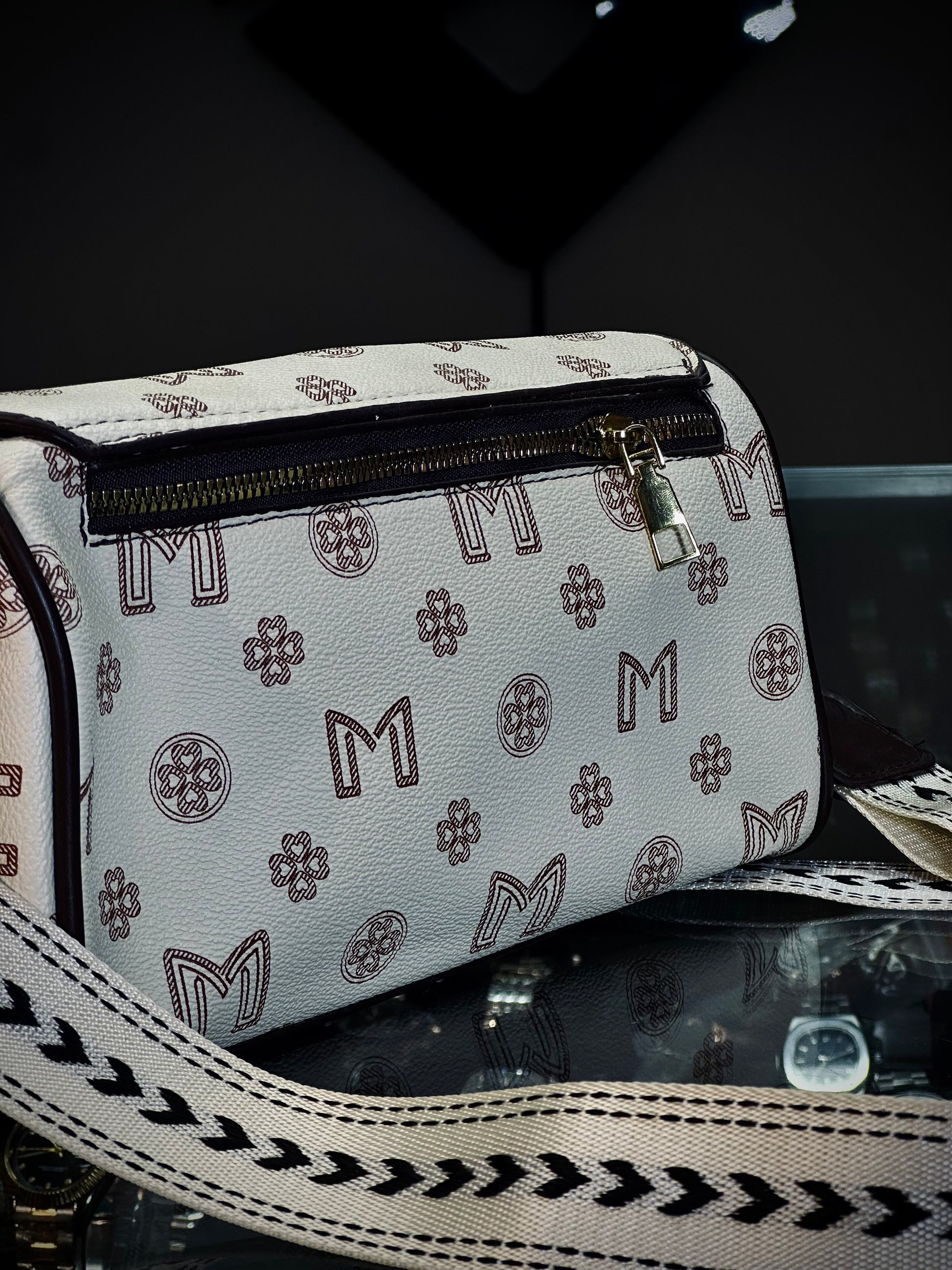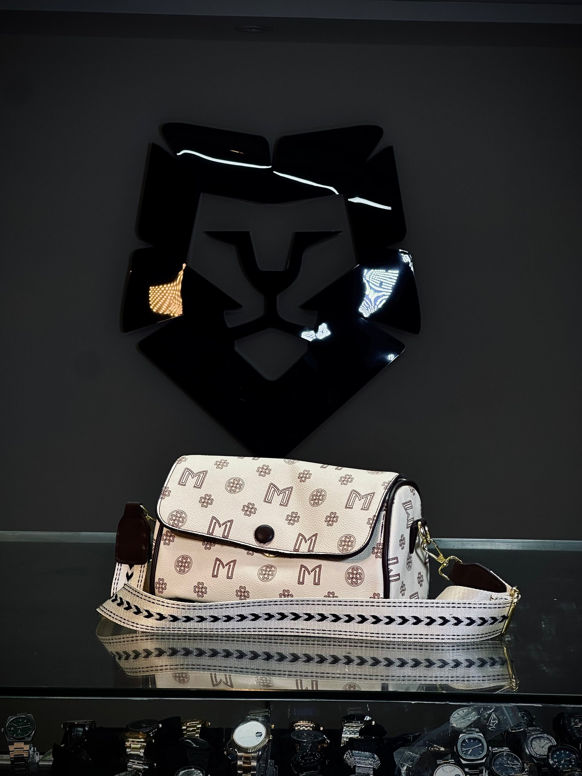 - Premium faux leather with iconic M monogram