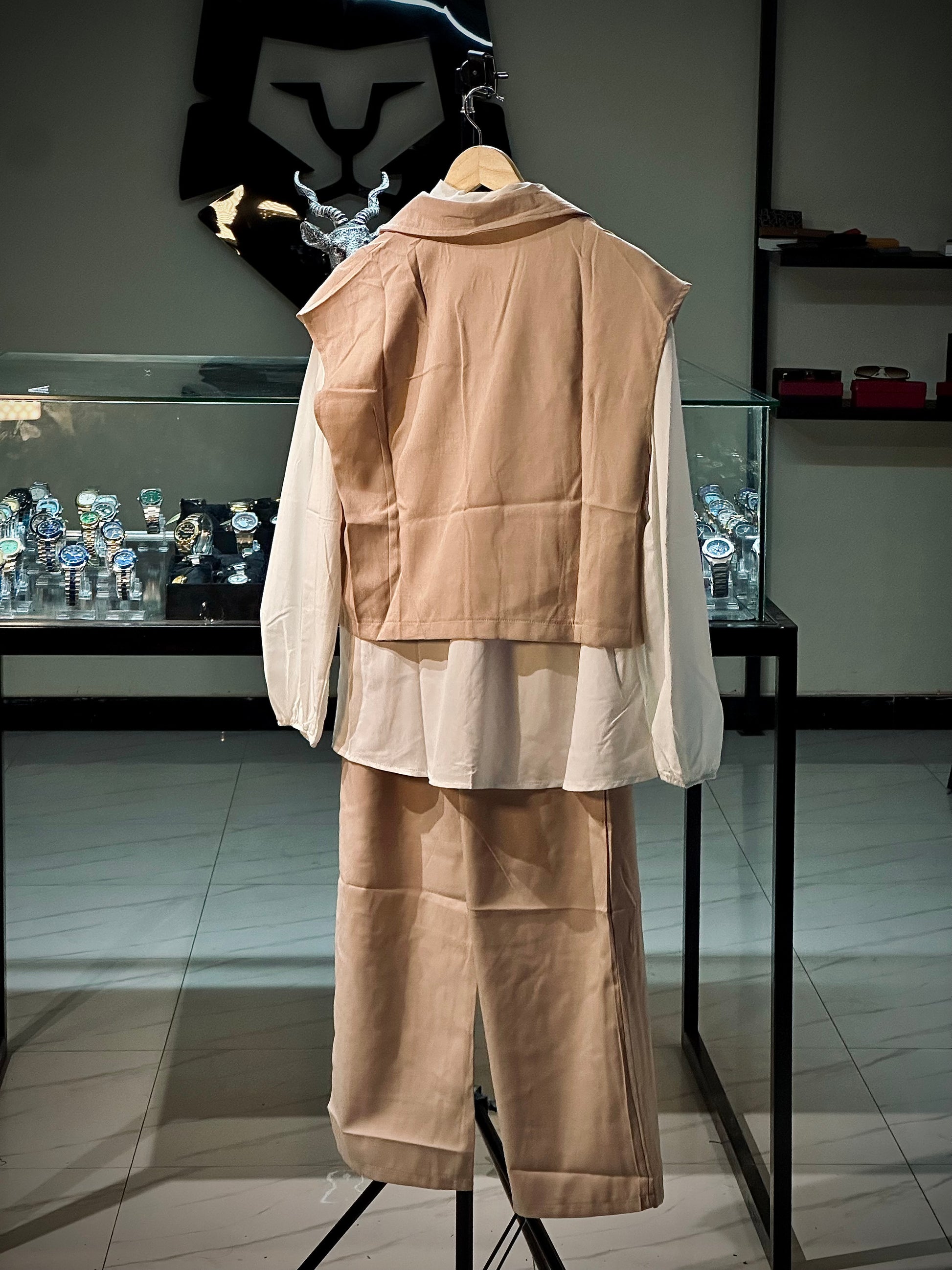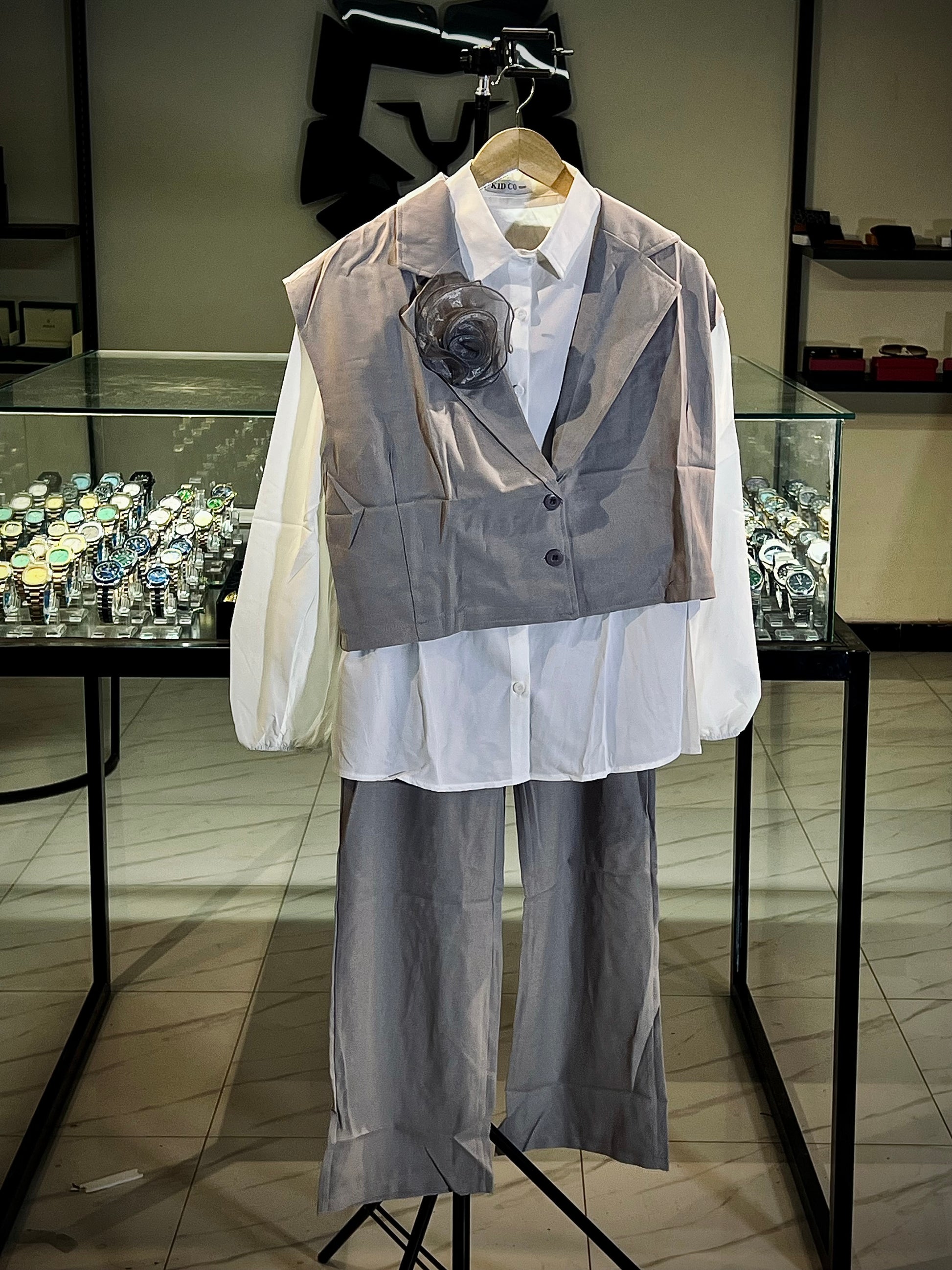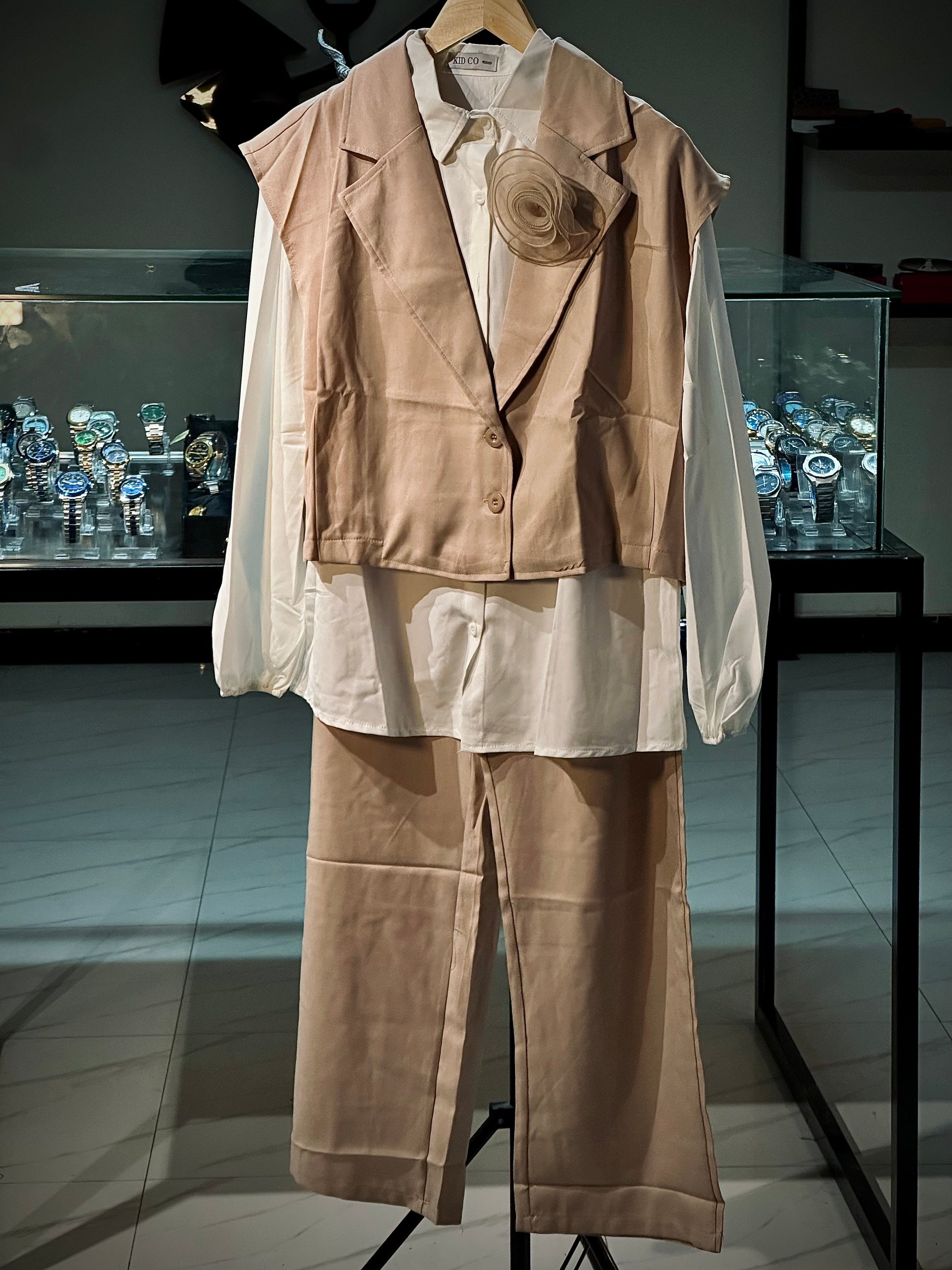 Elevate your wardrobe with our 3 PC Blazer Set – the perfect blend of modern minimalism and feminine flair. This coordinated set includes a crisp white inner shirt, wide-leg trousers, and a sleeveless cropped blazer adorned with a delicate floral brooch for a touch of elegance.